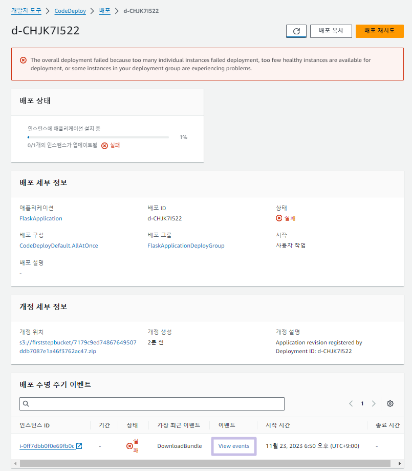 CodeDeploy에서 이벤트 주기가 가능하지 않으니, 배포하는 서버의 log를 보라는것